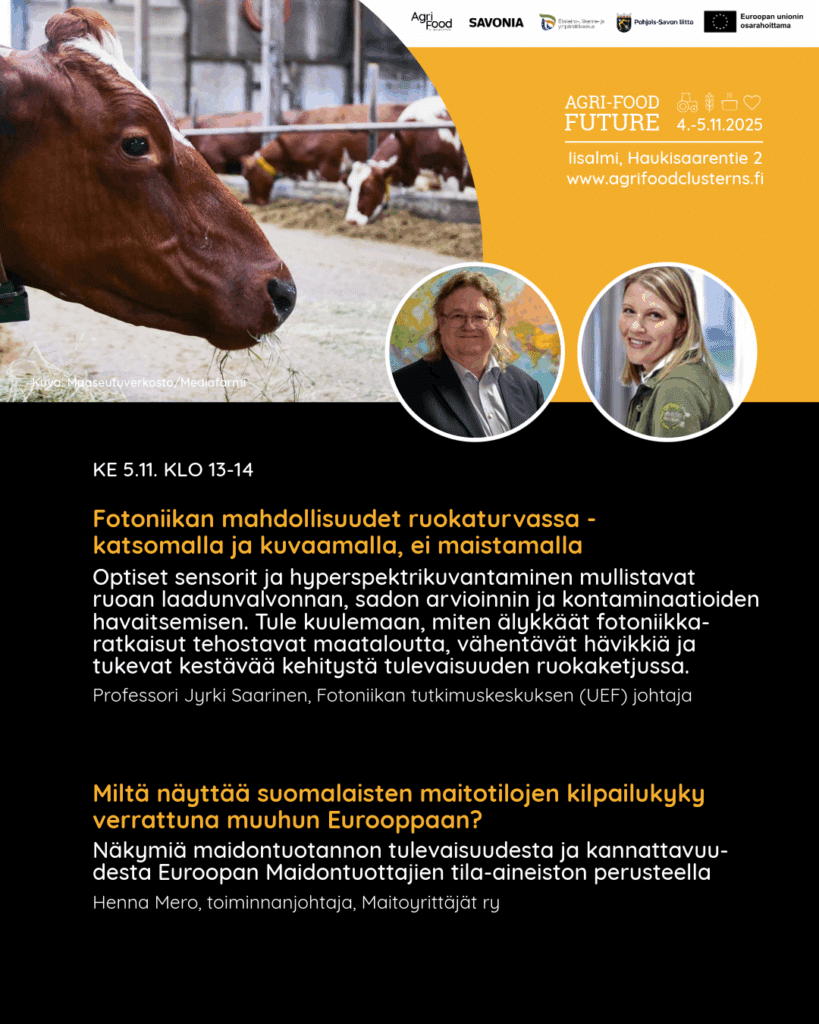 Koko ruokaketjun maksuton tapahtuma Agri-Food Future järjestetään Iisalmessa 4.-5.11. Kaksipäiväinen seminaari- ja verkostoitumistapahtuma tarjoilee kattauksen inspiroivia puheenvuoroja, katsauksia alan ajankohtaisiin aiheisiin sekä odotettuja ja odottamattomia kohtaamisia. Tapahtuman järjestävät Pohjois-Savon Agri-Food klusteri ja Savonia-ammattikorkeakoulu yhteistyökumppaneineen. Agri-Food klusteri on Euroopan unionin osarahoittama.